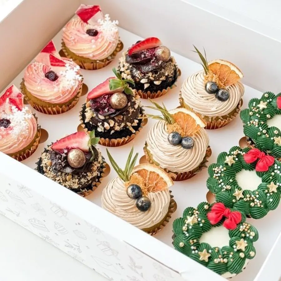Deck your holiday table with our delightful Gourmet Christmas Cupcake box featuring 12 healthier lowered in sugar Christmas cupcakes! Our Christmas cupcake set brings together four cosy, hand-decorated designs. Think buttercream Christmas wreaths, artisanal peppermint chocolate snaps, rustic swirls, and soft snowflakes. It’s the kind of dessert you’d proudly set out for guests, or quietly enjoy with a cup of warm cocoa this festive!
