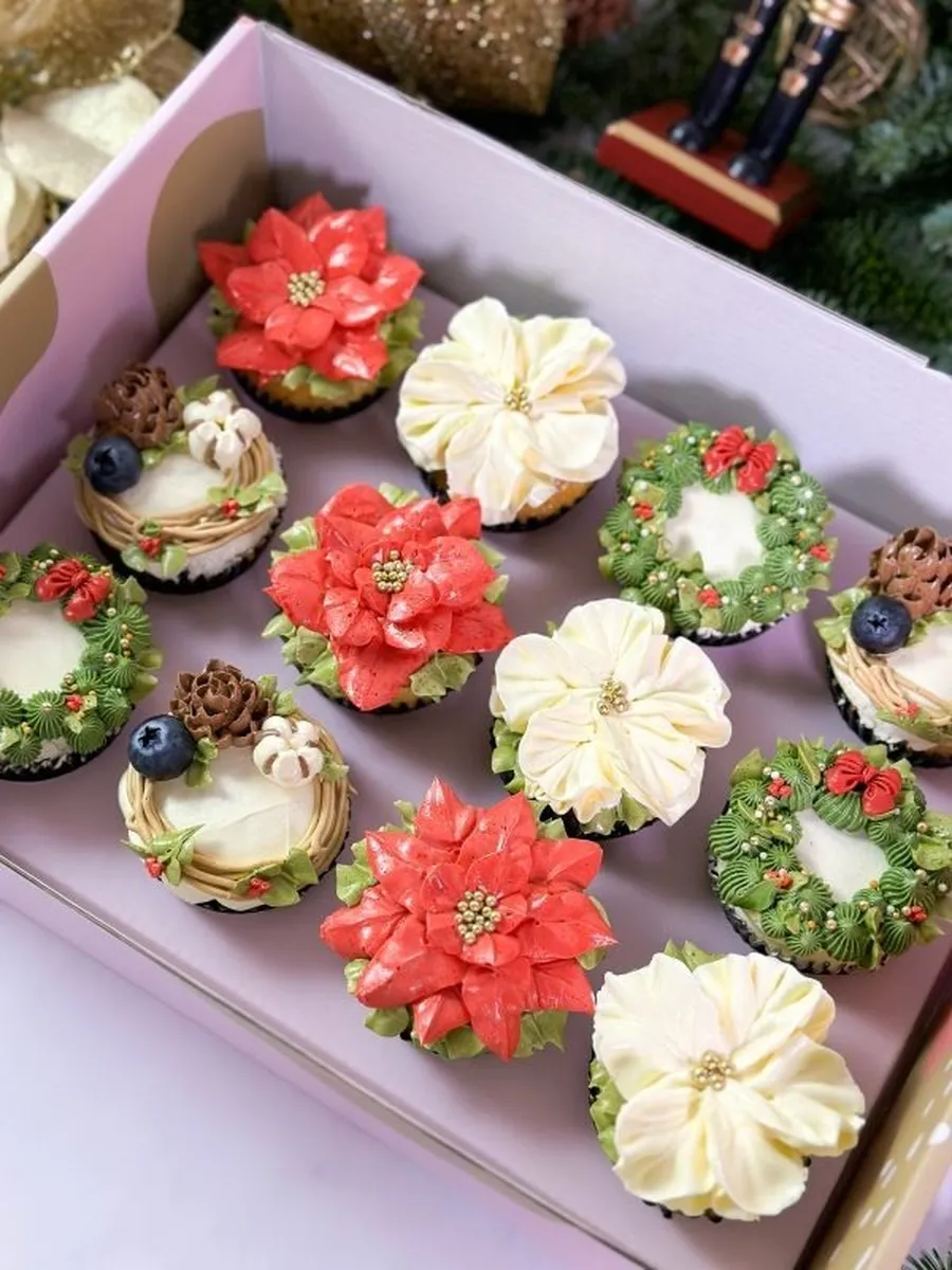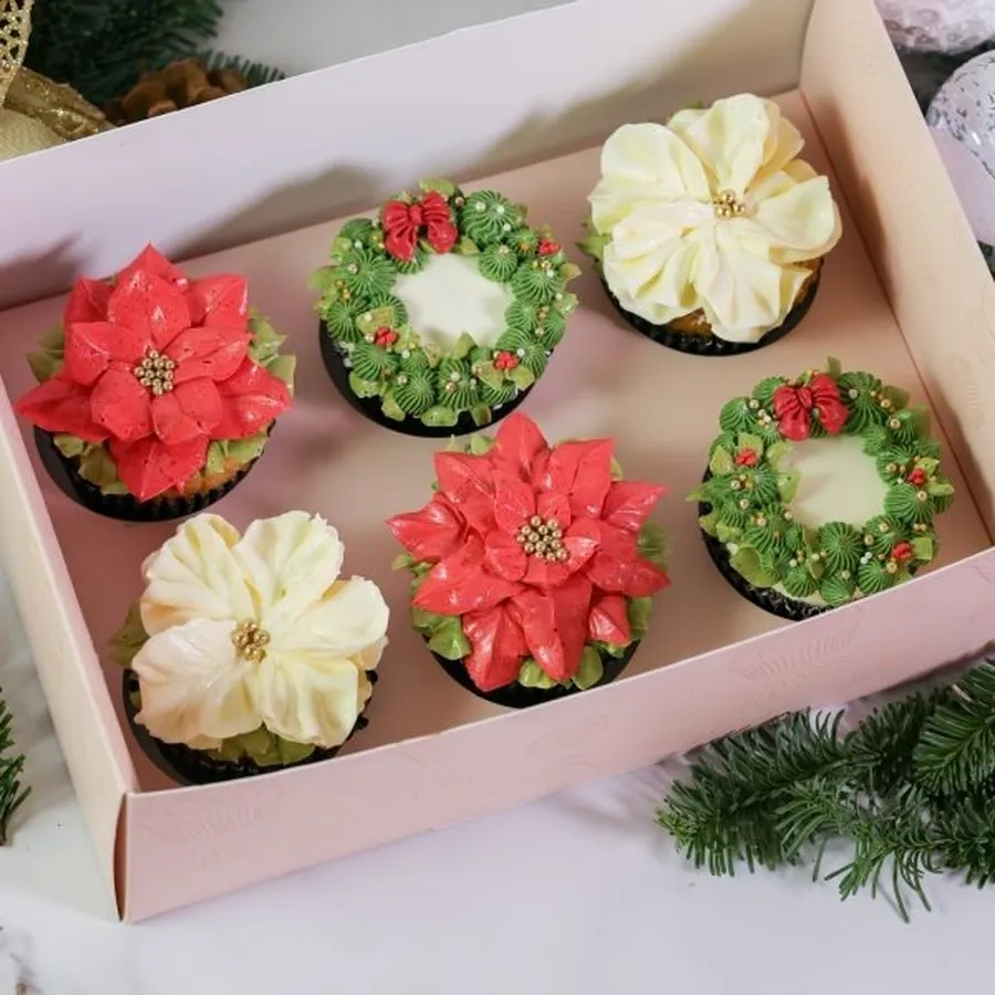 Our signature floral cupcakes strutting up in Christmas style, these delightfully moist cupcakes crowned with our velvety smooth buttercream makes the perfect festive gift sets!