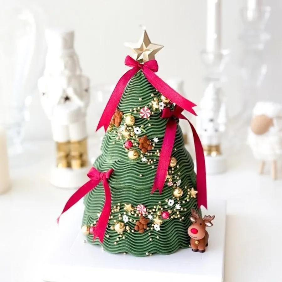 Make Christmas extra magical this delicious showstopper! Piped with swirls of Christmas green buttercream you cant get enough of, studded with gold pearls and delicate snowflakes, crowned with a gold star candle and accompanied by a toy Reindeer, this cake is a feast for the eyes and a centrepiece for your holiday parties!