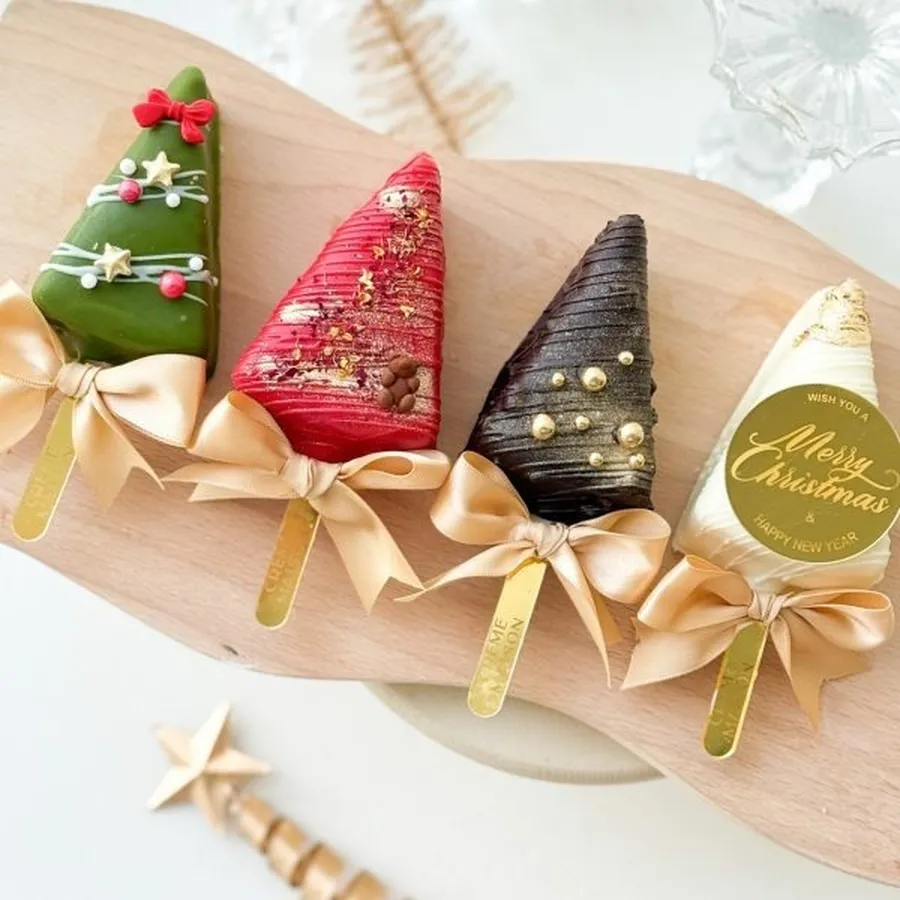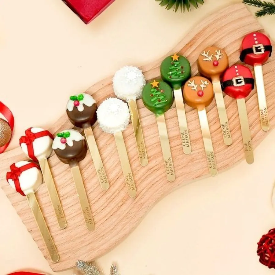 Our festive cheesecake lollies are a playful twist on tradition! These individual New York cheesecake slices are dipped in velvet smooth chocolate, finished with hand-decorated Christmas designs. Perfect for the festive Christmas gifting, corporate handouts and handy party desserts!