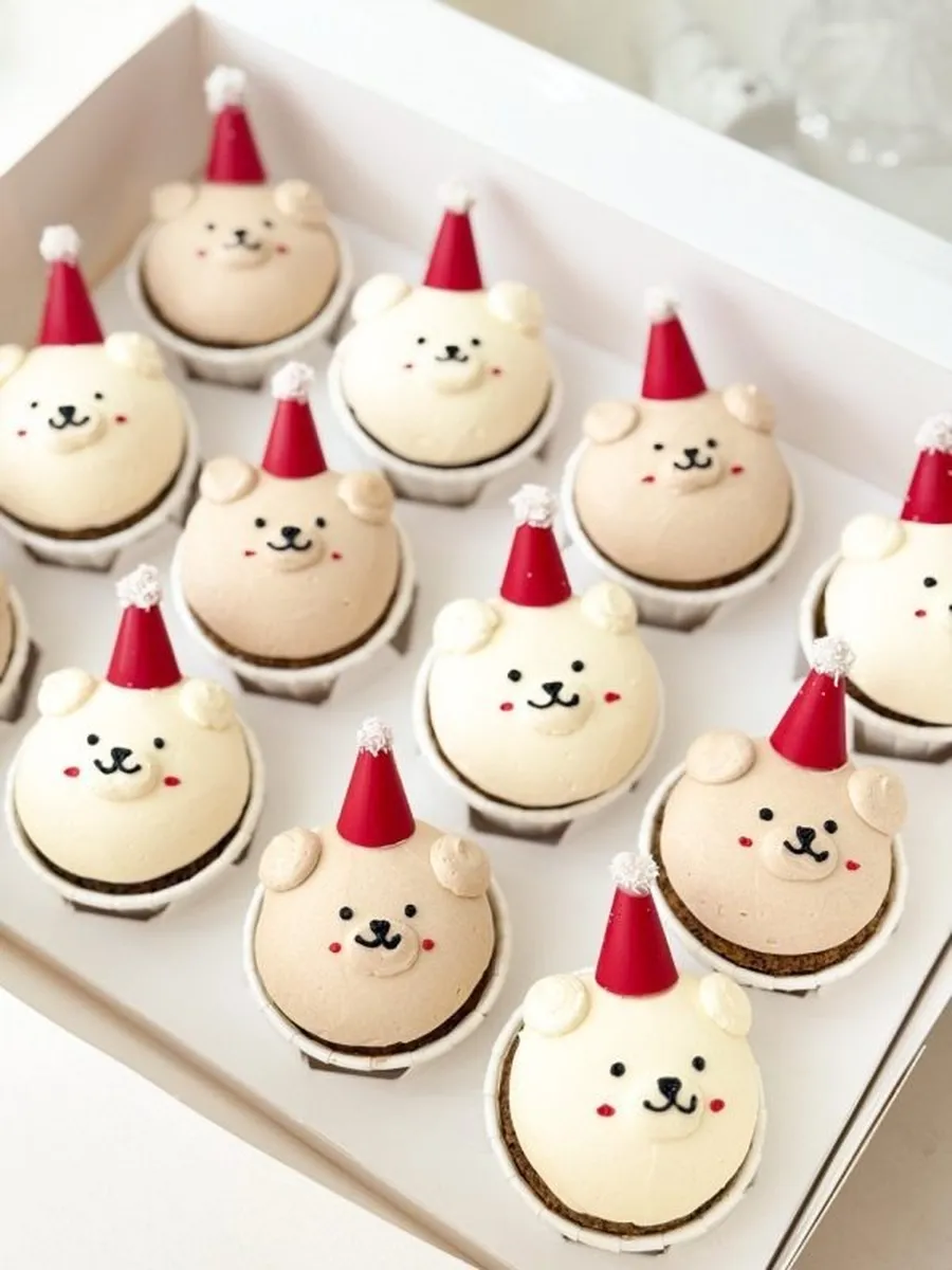 Adorably Christmasy and perfect for sharing, these Santa bear mini cupcakes are topped with piped buttercream faces and finished with a chocolate red santa hat. Made with a lower in sugar buttercream that doesn’t compromise on taste, they’re a hit at office parties, holiday gatherings, and anywhere joy is on the menu!