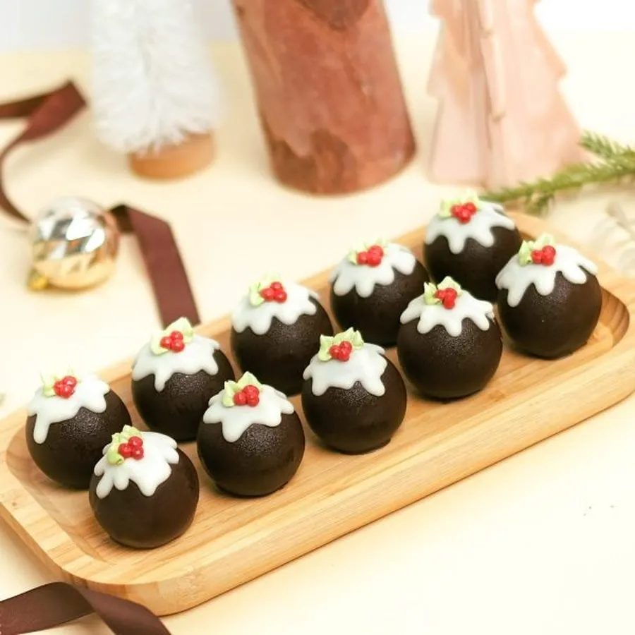 Unwrap a little holiday magic with our Christmas Pudding Cake Truffles—each moist Chocolate Peppermint cake truffle coated with Belgian Dark Chocolate is crowned with white chocolate drizzle and cream piped Holly! These adorable, mini treats are crafted to look like festive Christmas puddings and are lower in sugar, making them a perfect, diabetic-friendly choice for guilt-free holiday enjoyment.