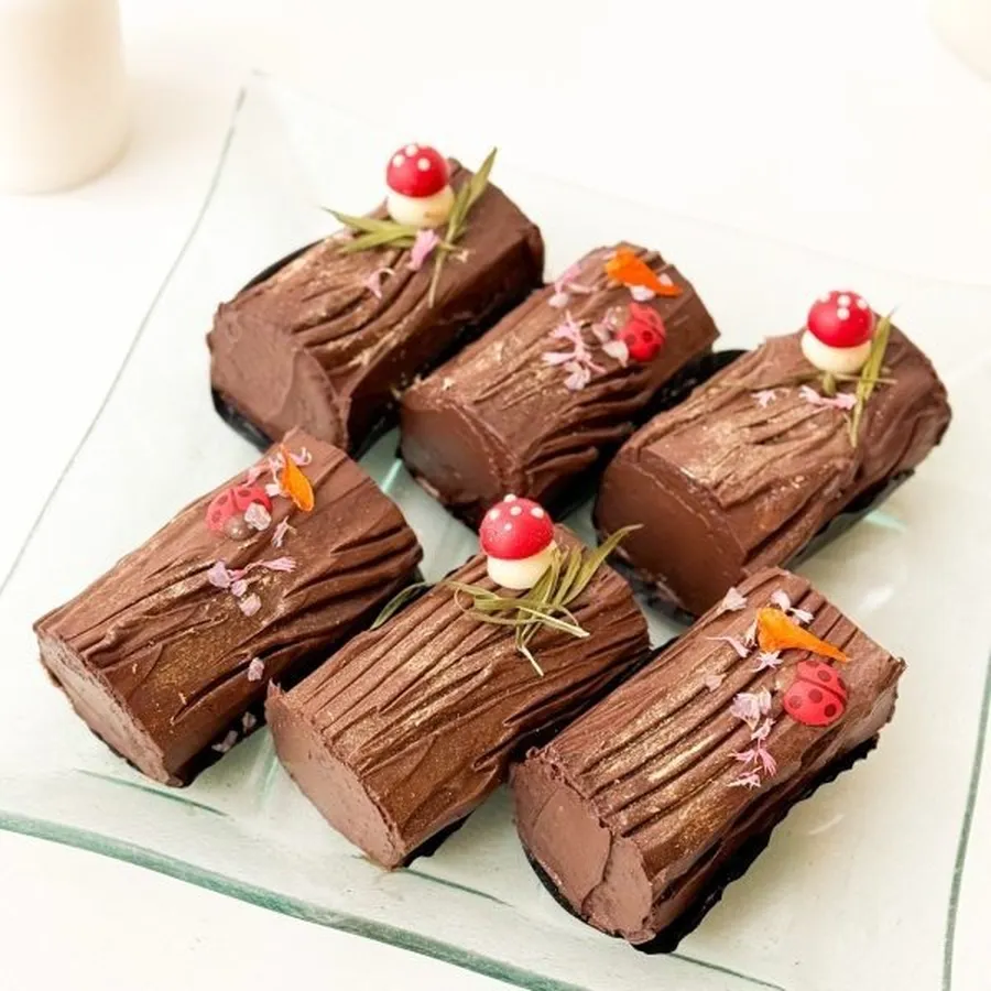 Bring the magic of a European Christmas to your table with our exquisite Mini Belgian Chocolate Log Cake set. This deliciously rich box of 6 individual log cakes topped with chocolate toadstools or ladybugs and edible flowers is the ultimate holiday dessert, making it easy to share, gift, or serve at your festive gathering.
