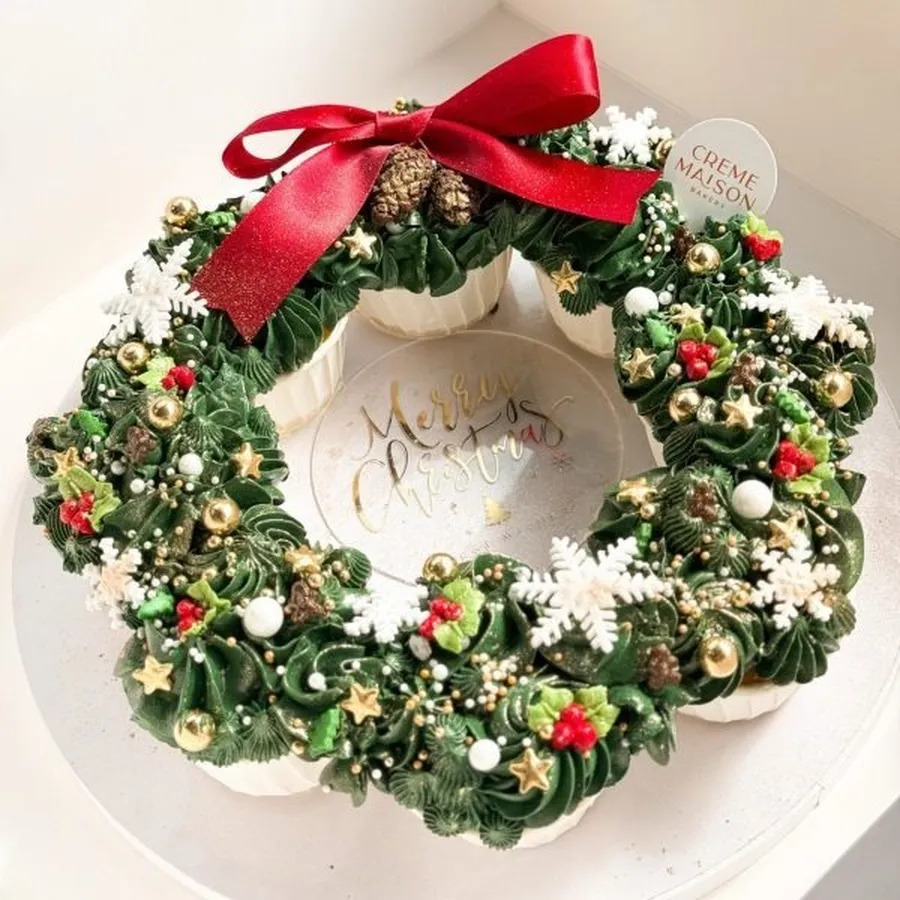 Pull, share, and jingle all the way! Our Christmas wreath pull apart cupcakes are a merry edible present made of moist cupcakes, swirled with velvet smooth buttercream, sprinkled with stars, snowflakes, and holiday cheer! All glammed up with a satin red bow. Grab a cupcake and celebrate!