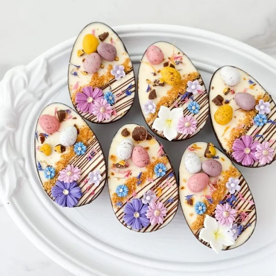 Indulgence in a Chocolate Shell! We have the creamiest and the most lusciously smooth cheesecake layered on crisp graham and feuilletine layer, encased in a crisp Belgian chocolate shell, topped with luxurious Easter eggs and edible flowers. Perfect as gifts and as Easter desserts!