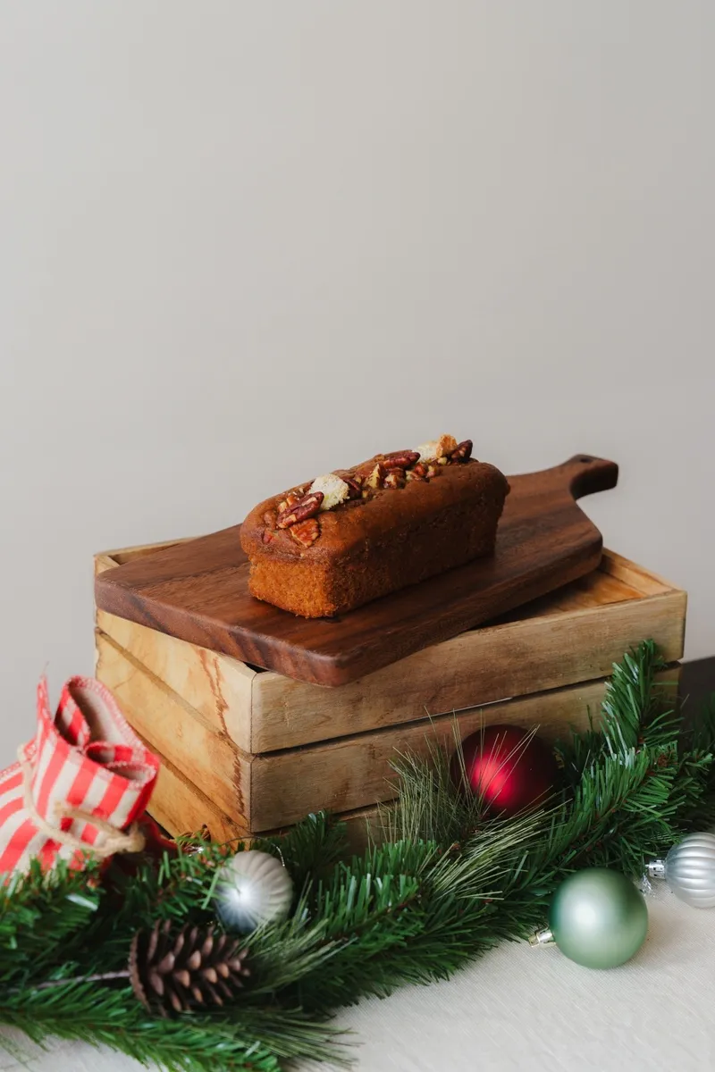Infused with the zest and juice of fresh oranges and the comforting spice of ginger, this loaf is perfectly complemented by the natural crunch of roasted pecans and topped with hand-made candied ginger.
