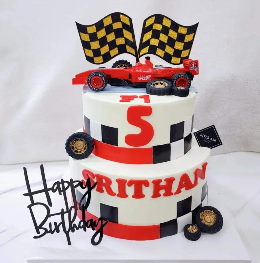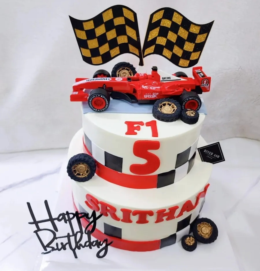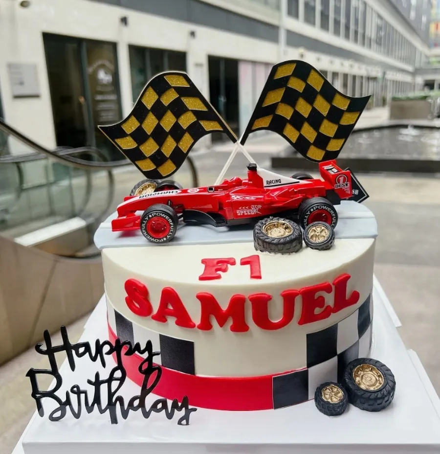 This 4" mini cake is frosted red color buttercream and decorated with dark chocolate, racing car flag and Mcqueen car toy come with 20 cupcake which with red buttercream piping and cut out paper topper and white sprinkles. Our 4" cake series are instagram-worthy, ideal for school celebration and great for gifting!