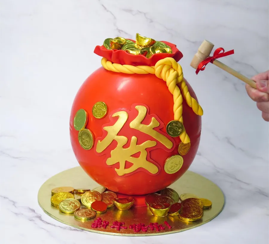 發財! 發財! 發財! Spread the wealth with our Money Bag 發 Chocolate Piñata! The Huat Pinata features a chocolate shell hiding the surprise inside.