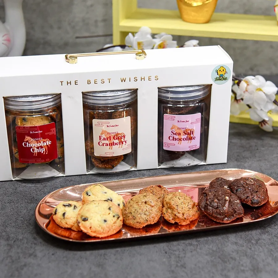 Each CNY Cookies Gift Box includes a set of 3 delicious cookie flavours (1x Earl Grey Cranberry, 1x Sea Salt Chocolate, 1x Chocolate Chip).