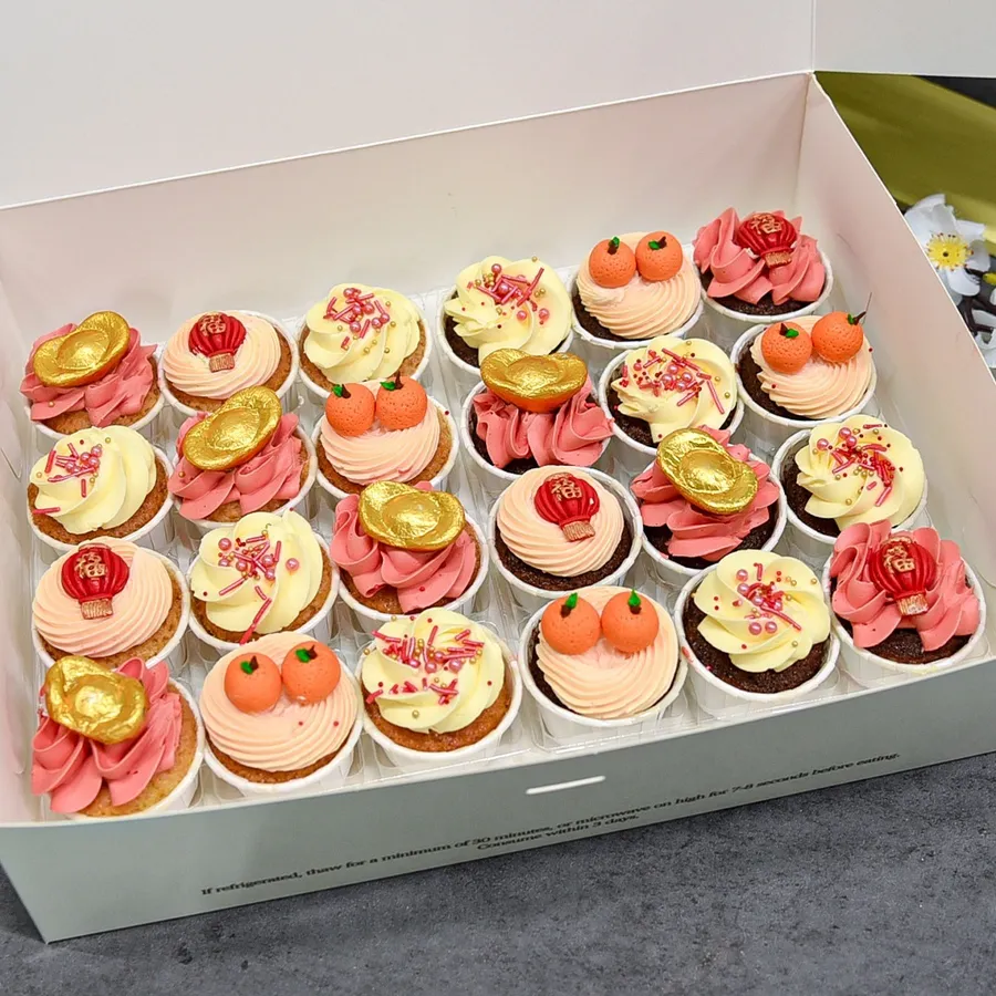 Share an abundance of blessings with Bountiful CNY Mini Cupcakes! Topped with themed Chinese New Year decor like chocolate gold ingots and fondant mandarin oranges. Perfect for sharing with loved ones during reunion gatherings and celebrating the new year at corporate parties.