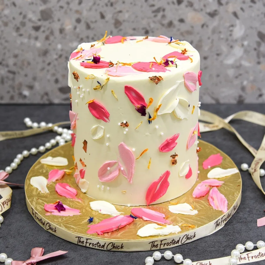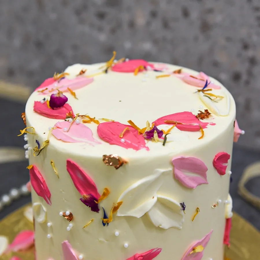 Add a touch of elegance with our petal smears floral cake. Featuring palette knife painted flower petal designs and complemented by floral elements, it’s perfect for chic celebrations. This cake is ideal for those who appreciate understated beauty with a modern twist.