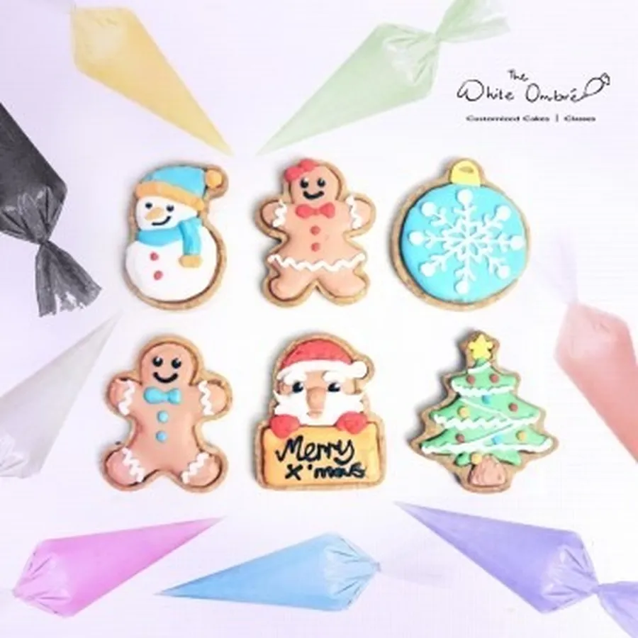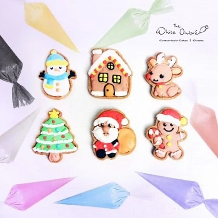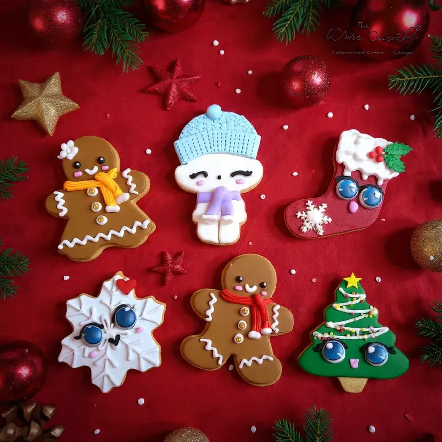 Assorted Christmas themed designs of Santa Claus, Christmas Tree, Gingerbread House, Reindeer, Snowman, Gingerbread Man.