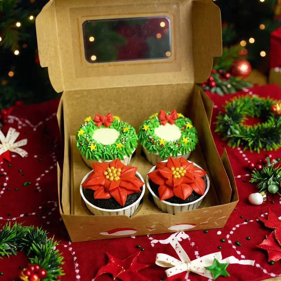 Set of 4 cupcakes gift set in Christmas wreath and poinsettia designs!