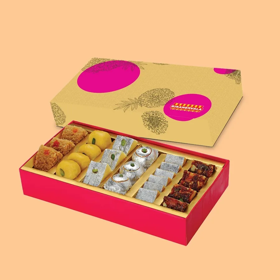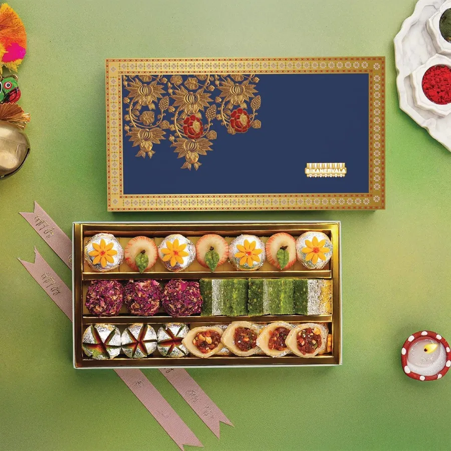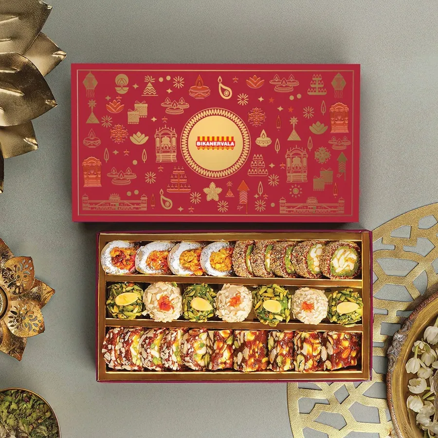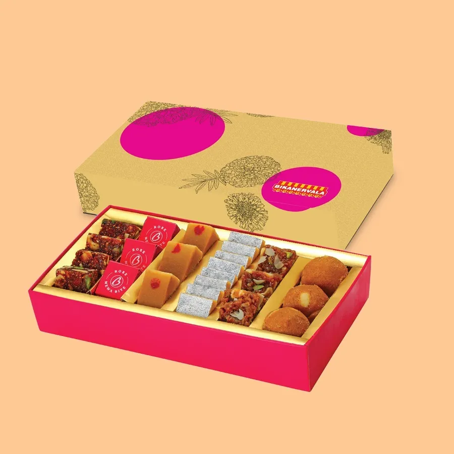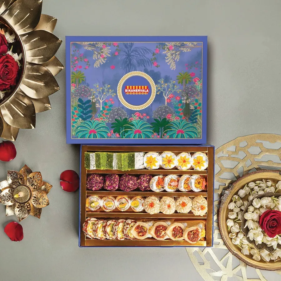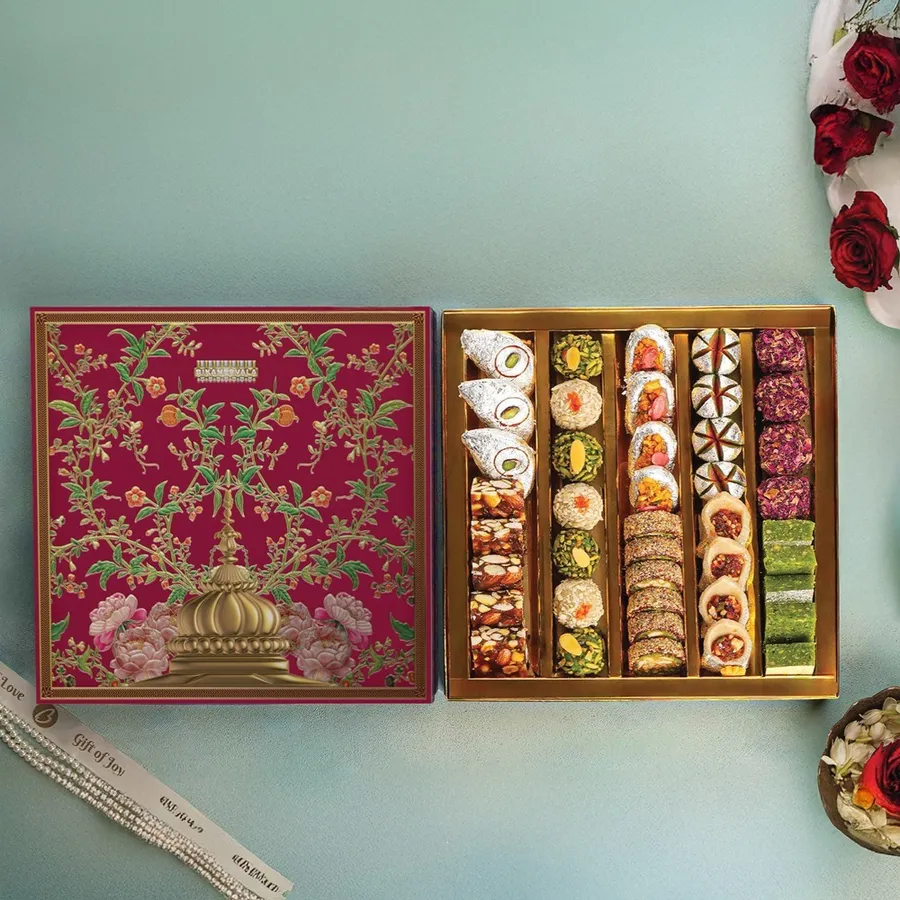 Included: Kaju Gujia, Khajoor Chikki, Pista Laddu, Badam Laddu, Kaju Basket, Anjeer Chakkar, Kaju Rajkamal, Kaju Pan, Rose Laddu, Pista Lauj