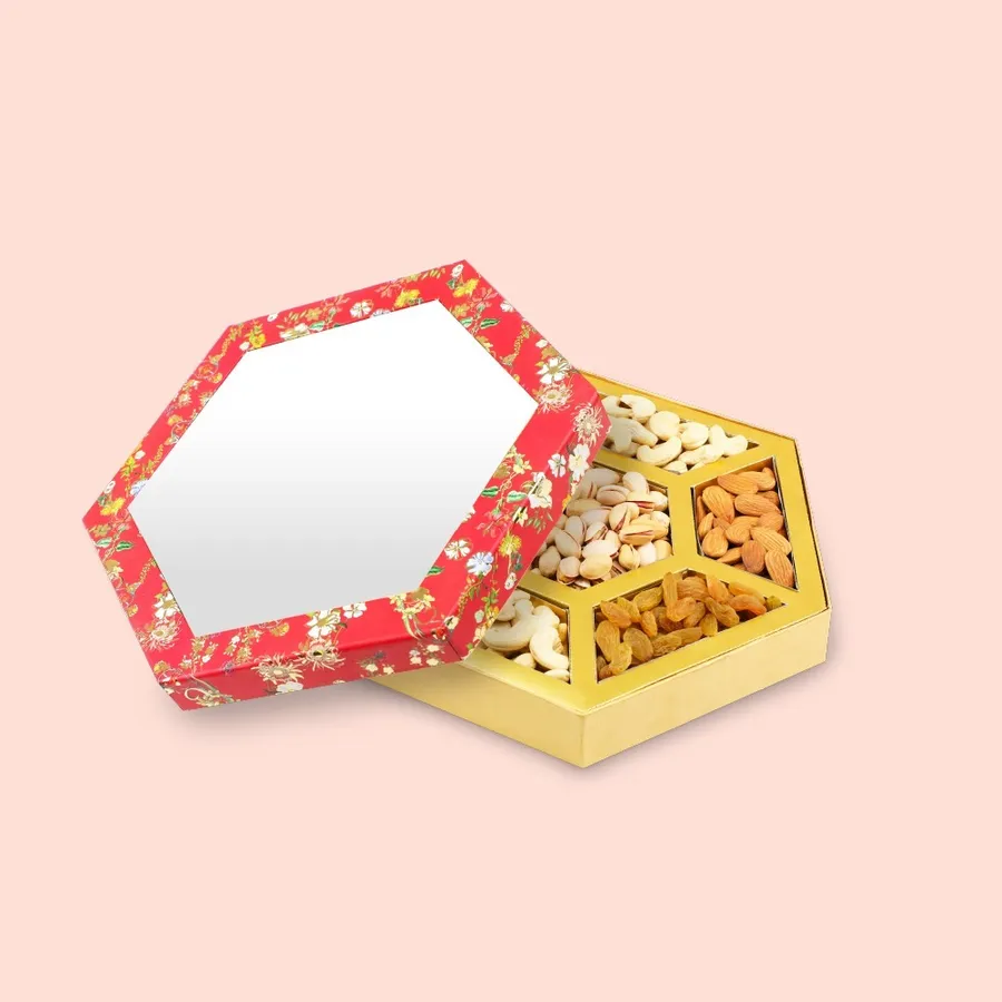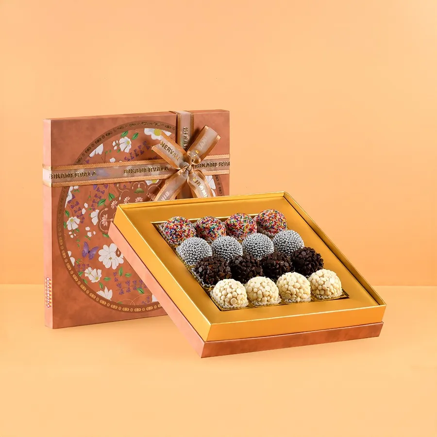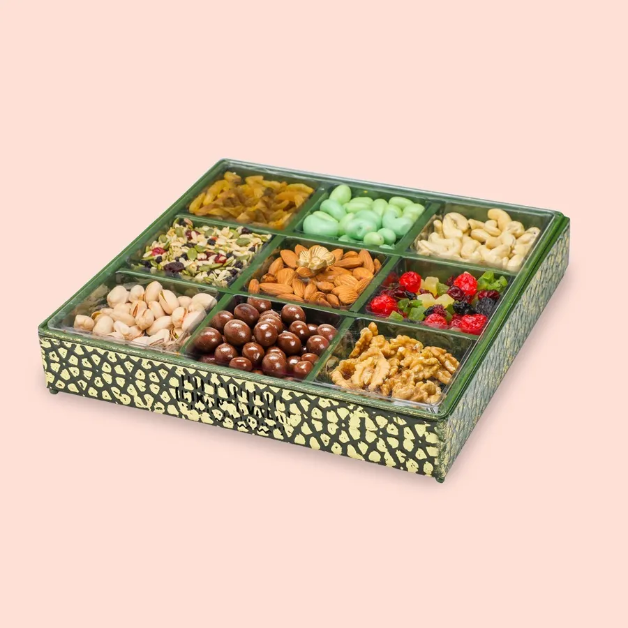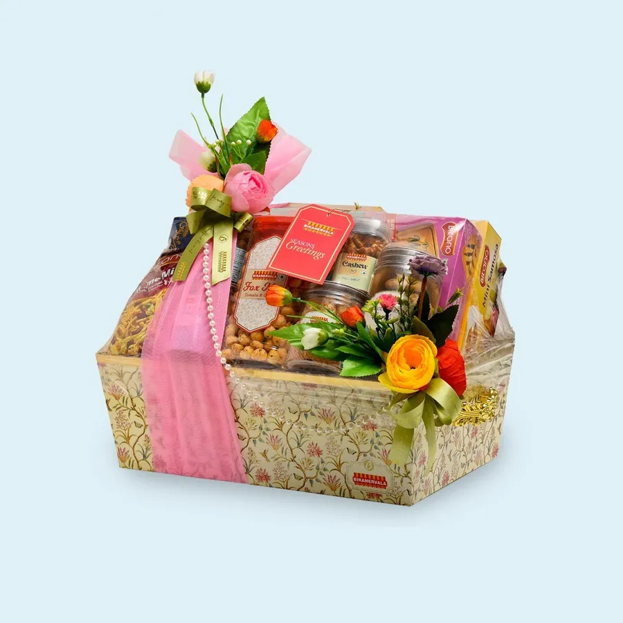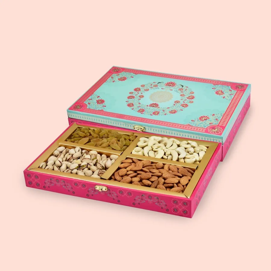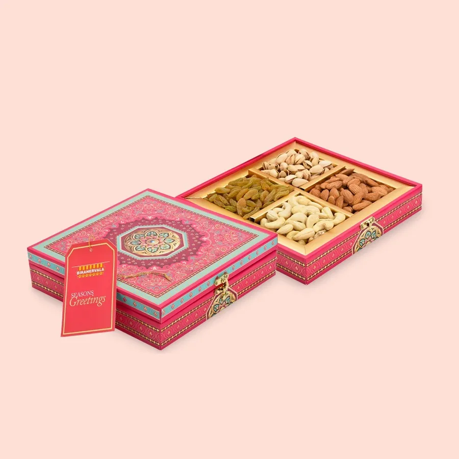 Included: Kaju Gujia, Khajoor Chikki, Pista Laddu, Badam Laddu, Kaju Basket, Anjeer Chakkar, Kaju Rajkamal, Kaju Pan, Rose Laddu, Pista Lauj