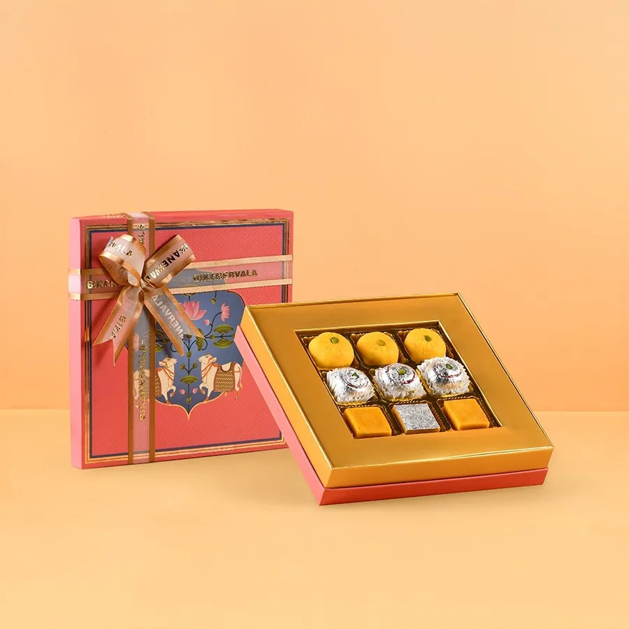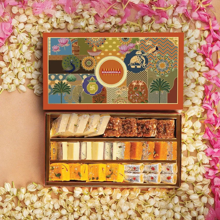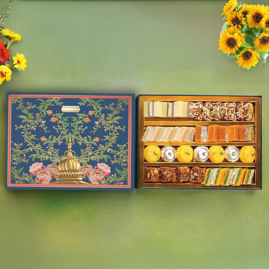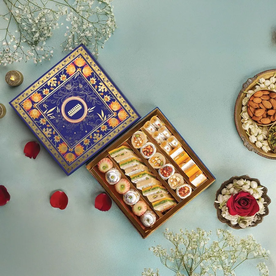 Included: Kaju Burfi, Khoya Kesar Peda, Khoya Badam Pista Burfi, Dhoda Special, Moong Dal Burfi, Kaju Dry Fruit Kaotri, Gulkand Katori, Kaju Dil Khush
