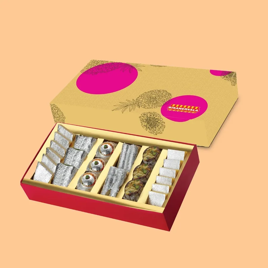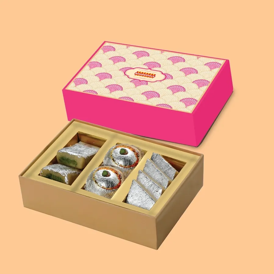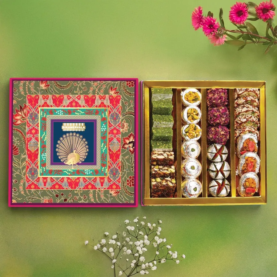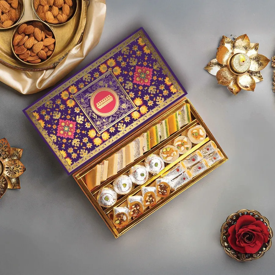 Included : Kaju Kesar Burfi, Kaju Lemon, Khoya Kesar Peda, Khoua Pista Burfi