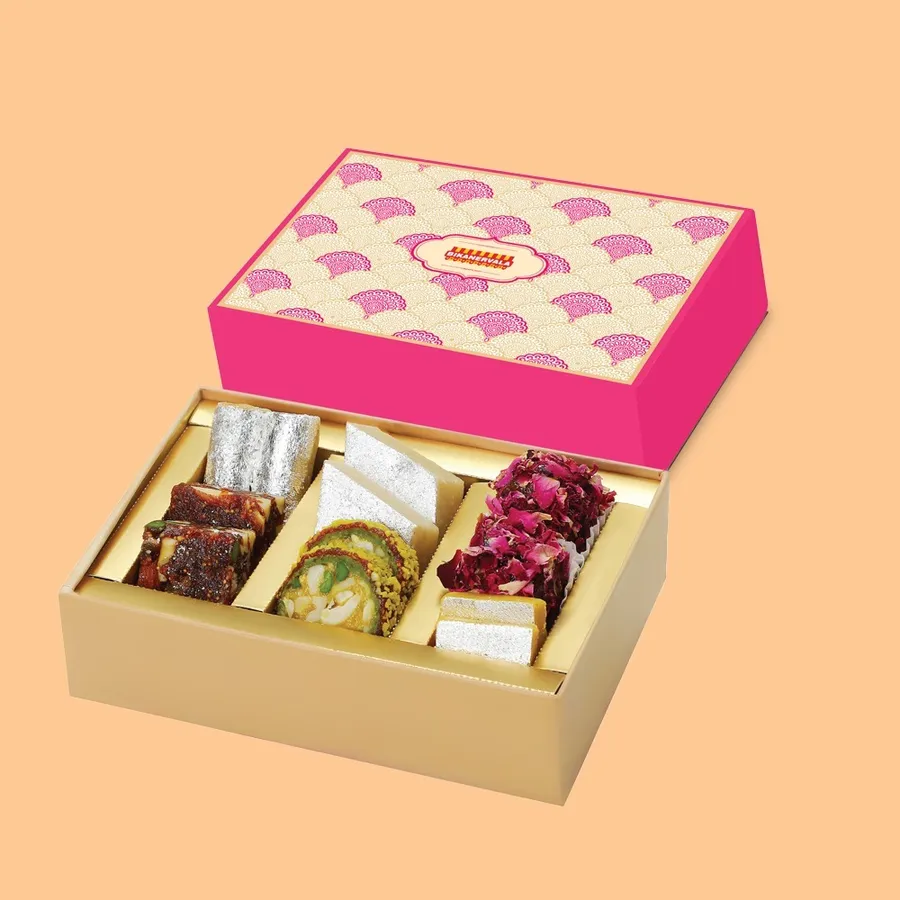 Included: Kaju Kesar Burfi, Rose Ladoo, Kaju Roll, Anjeer Chikki, Kaju Burfi , Anjeer Cake