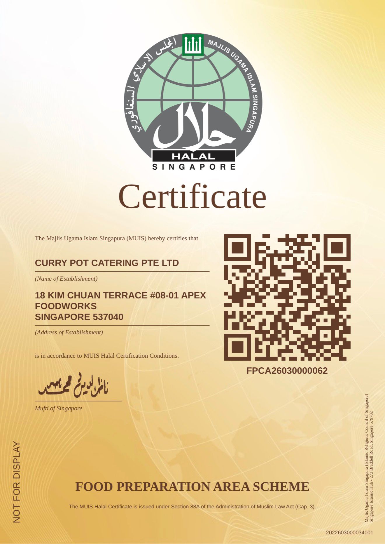Offering a splendid spread of dishes from our very own chef’s creation, we strive to offer customers a whole new experience in food catering. From the success of Chu Yi Kitchen Catering came the creation of Curry Pot Catering. Our ever popular signature curry chicken is the inspiration behind Curry Pot Catering. We have retained our authentic recipes that have been passed down through generations. With the emphasis on quality and freshness of ingredients used. This also represents our commitment in providing excellent food and services to our customers. Curry Pot Catering serves No Pork & No Lard Food.