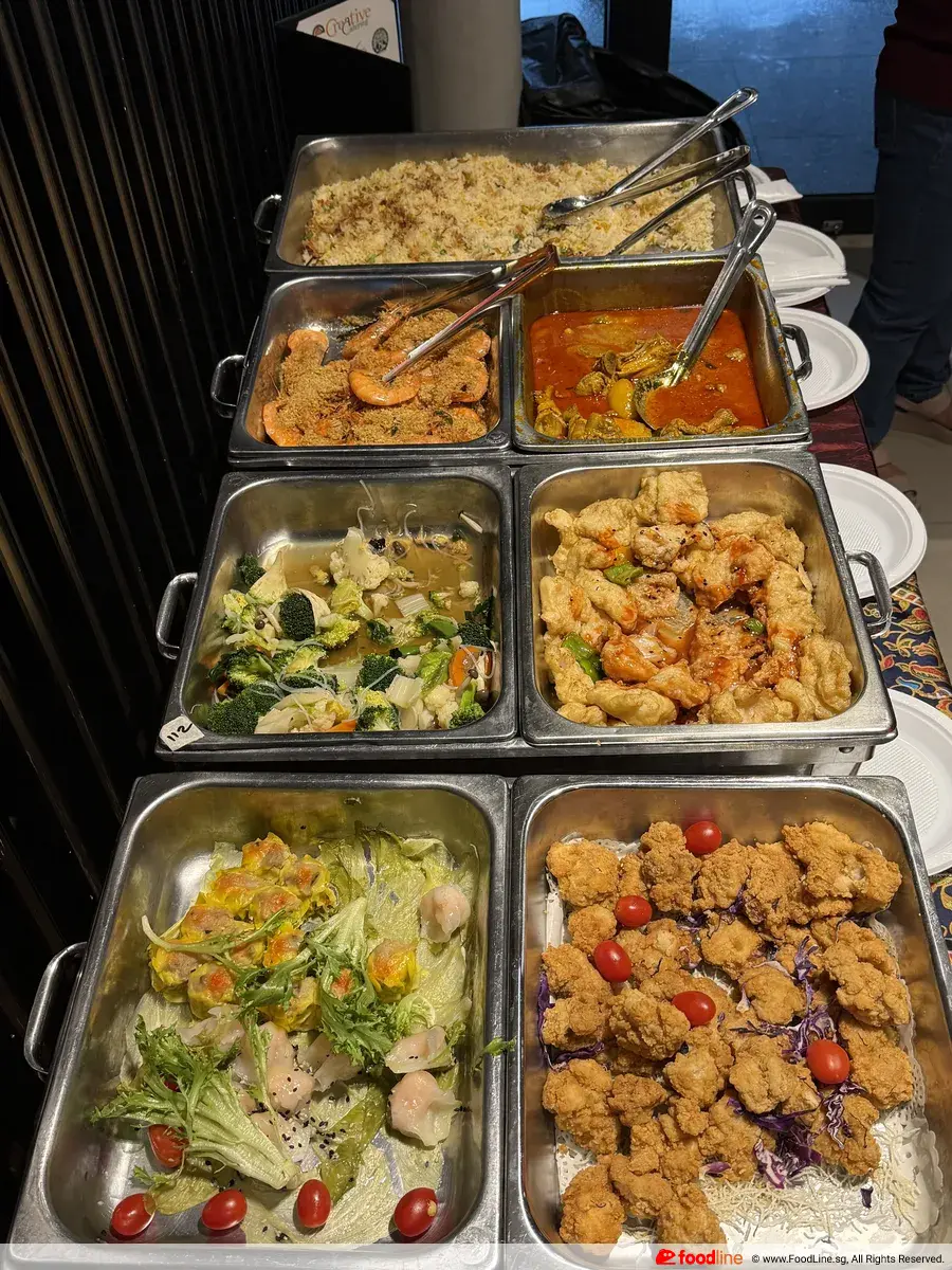 This buffet spread offers a delightful variety of dishes, from fragrant fried rice and rich curry to crispy fried chicken and fresh salads. The prawns and mixed vegetables look especially appetizing. Everything appears well-prepared and neatly ... More