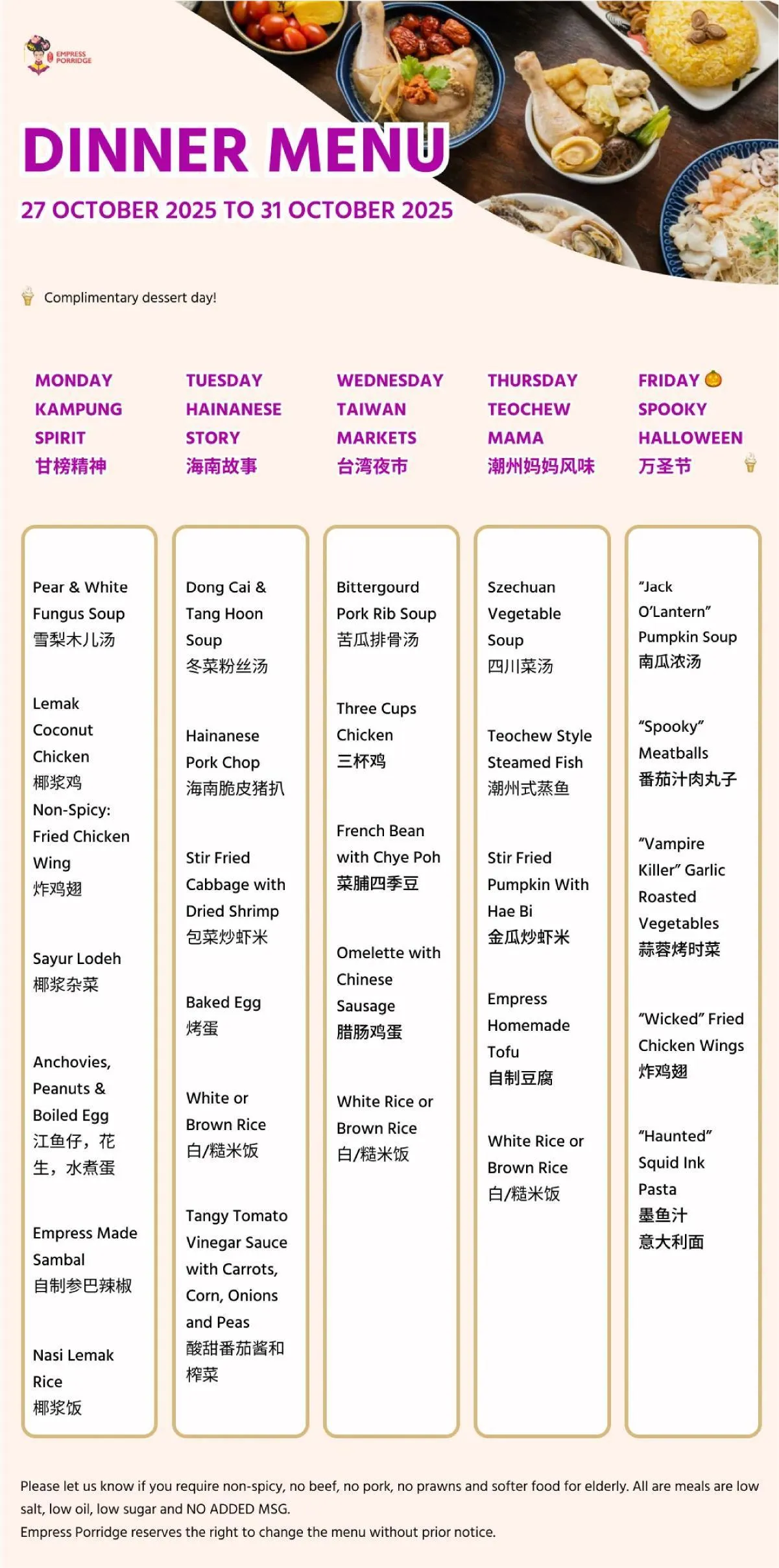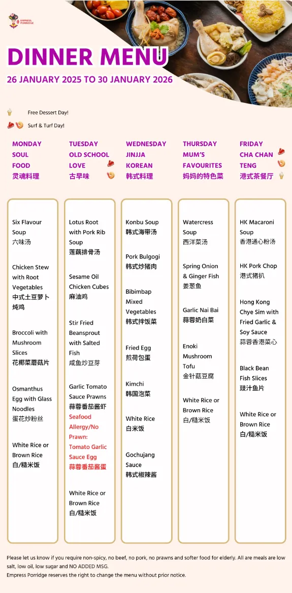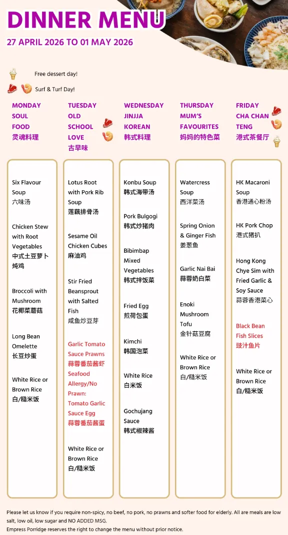 Empress PorridgeEmpress Porridge's premium tingkat dinners are specially curated dinners that provide a true taste of home. With no delivery surcharge and islandwide delivery, you can be sure that we can provide dinners for you and your family no matter where you stay. Besides that, we use no MSG and no processed foods for our dinners. Let us know ahead of time what your dietary requirements are and we will also try our best to accommodate.
