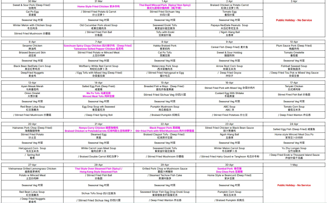 Delivery: Tingkat Services is only served from Monday to Friday. No delivery on Public Holidays, Saturdays/Sundays. No delivery charge.