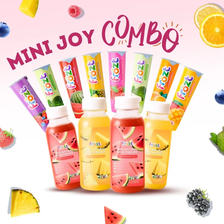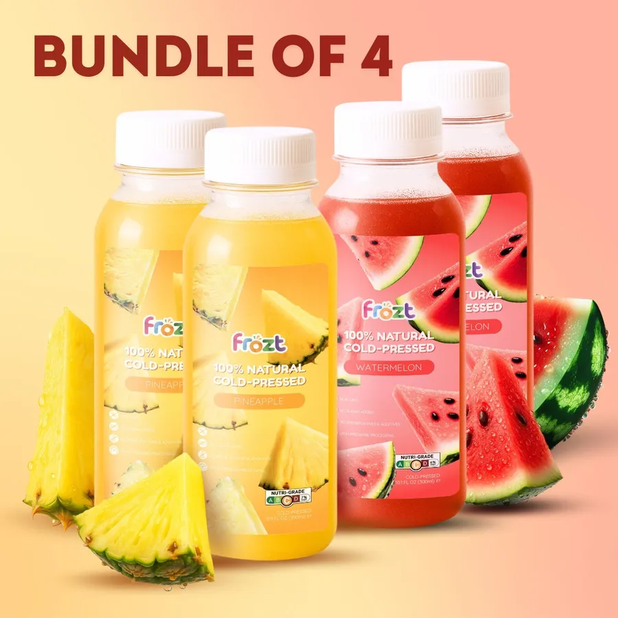 Your perfect starter pack of Frozt. A little bit of everything — 4 bottles of frozen cold-pressed juice and 8 popsicles made with real fruits.