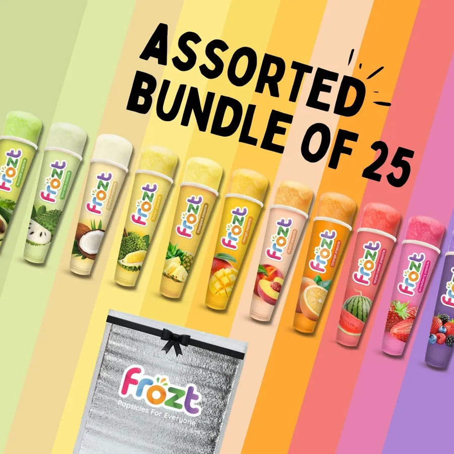 Our assorted bundle of 25 popsicles is the perfect treat for those who want to try a variety of all the flavours. Made with real fruits and free from dairy, gluten, and suitable for vegan, each popsicle is bursting with delicious and refreshing flavours that will tantalise your taste buds