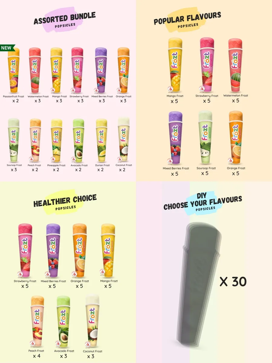 The assorted bundle includes flavours ranging from 3x Mango, 3x Strawberry, 2x Mixed Berries, 2x Watermelon, 2x Orange, 2x Soursop, 1x Passionfruit, 1x Durian, 1x Avocado, 1x Coconut, 1x Pineapple and 1x Peach.