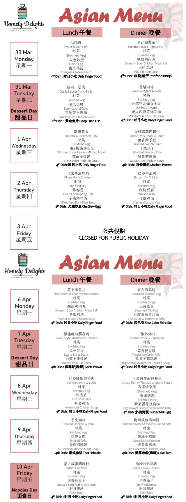 Delivery: Tingkat Services is only served from Monday to Friday, excluding Public Holidays and Weekends. No delivery charge.