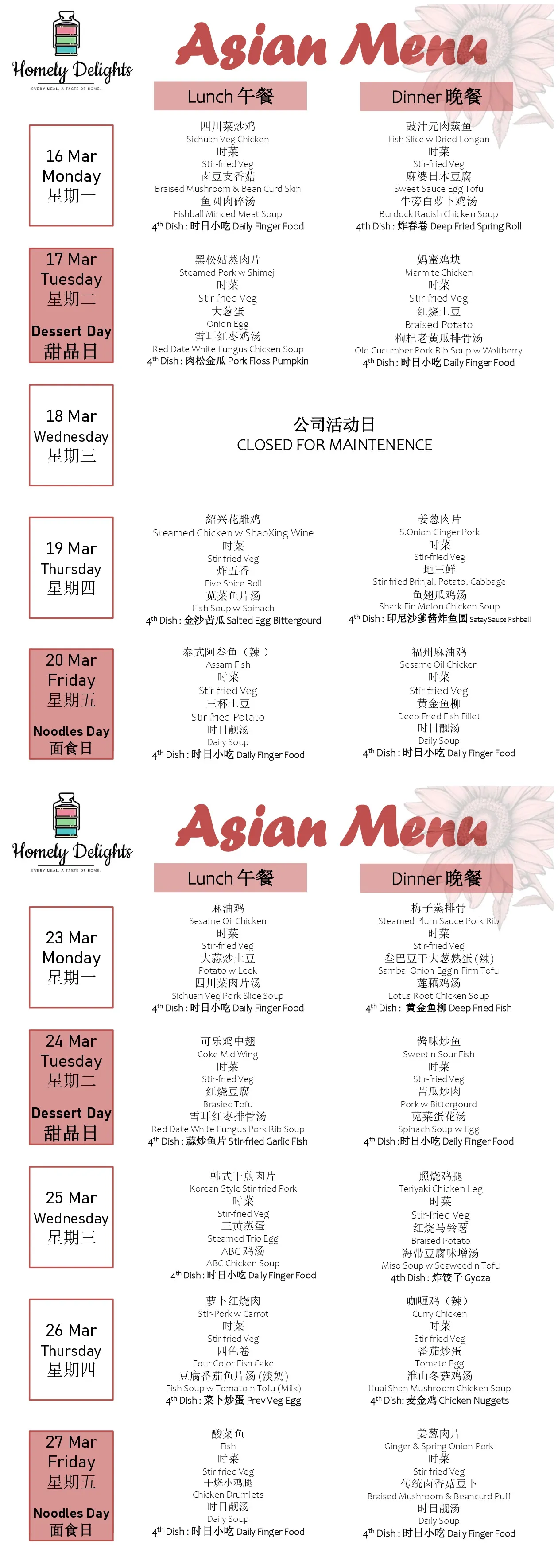 Delivery: Tingkat Services is only served from Monday to Friday, excluding Public Holidays and Weekends. No delivery charge.