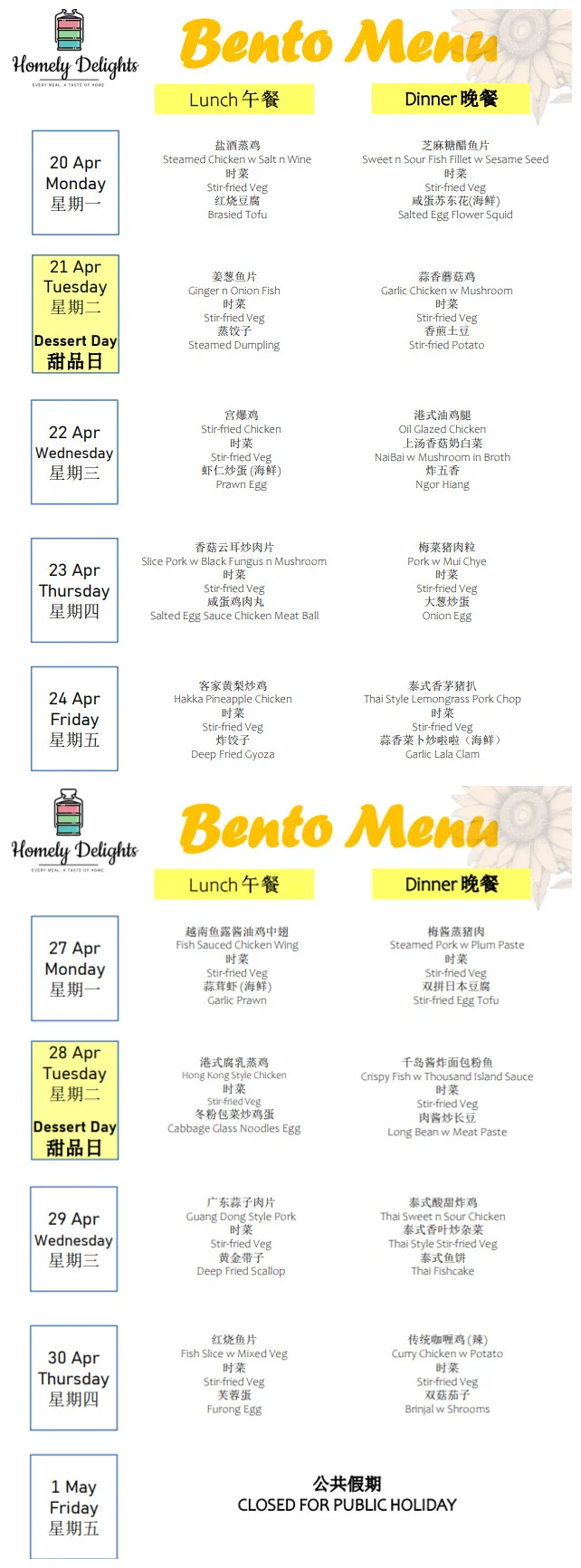 Delivery: Daily Meals is only served from Monday to Friday, excluding Public Holidays and Weekends. No delivery charge.