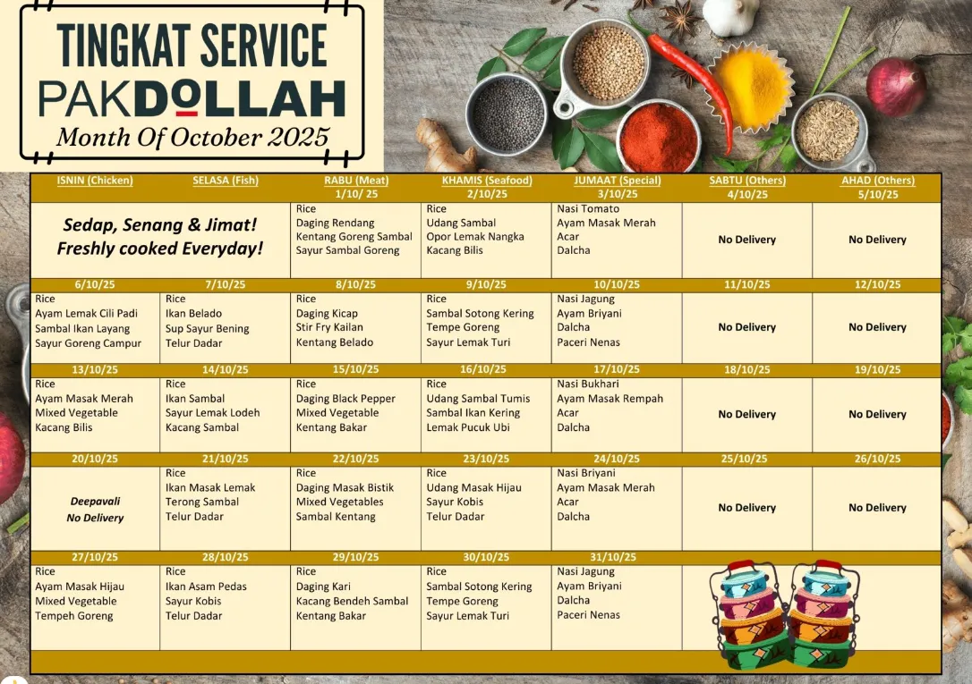 Delivery: Tingkat Services is only served from Monday to Friday. No delivery charge.