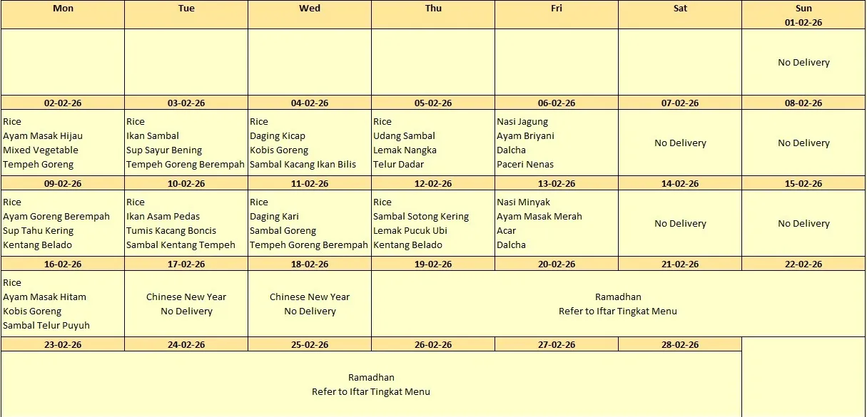 - This menu is NOT available on 17 Feb - 19 Mar 2026