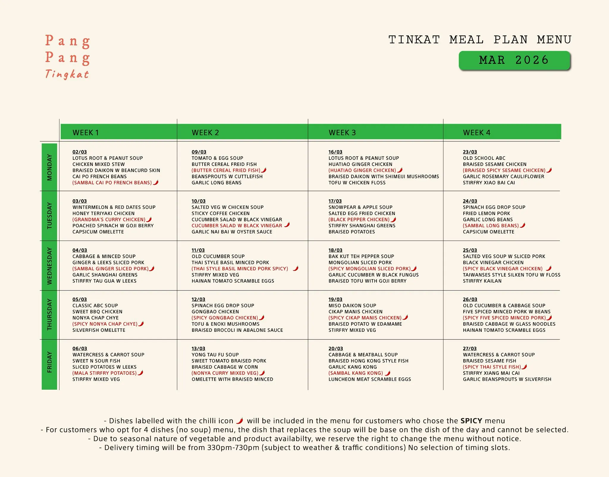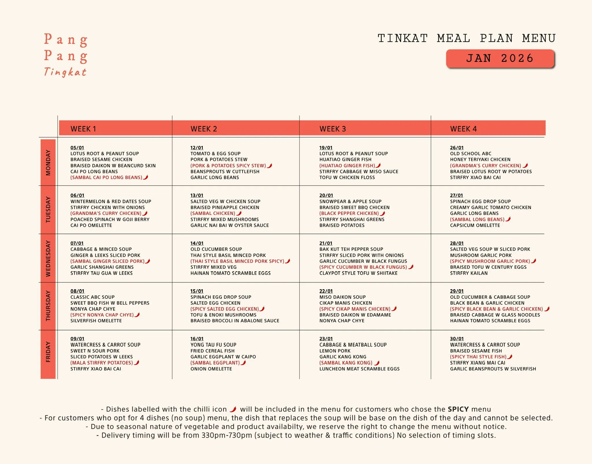 Delivery: Tingkat Services is only served from Monday to Friday. No delivery on Public Holidays, Saturdays/Sundays. No Lunch Delivery.