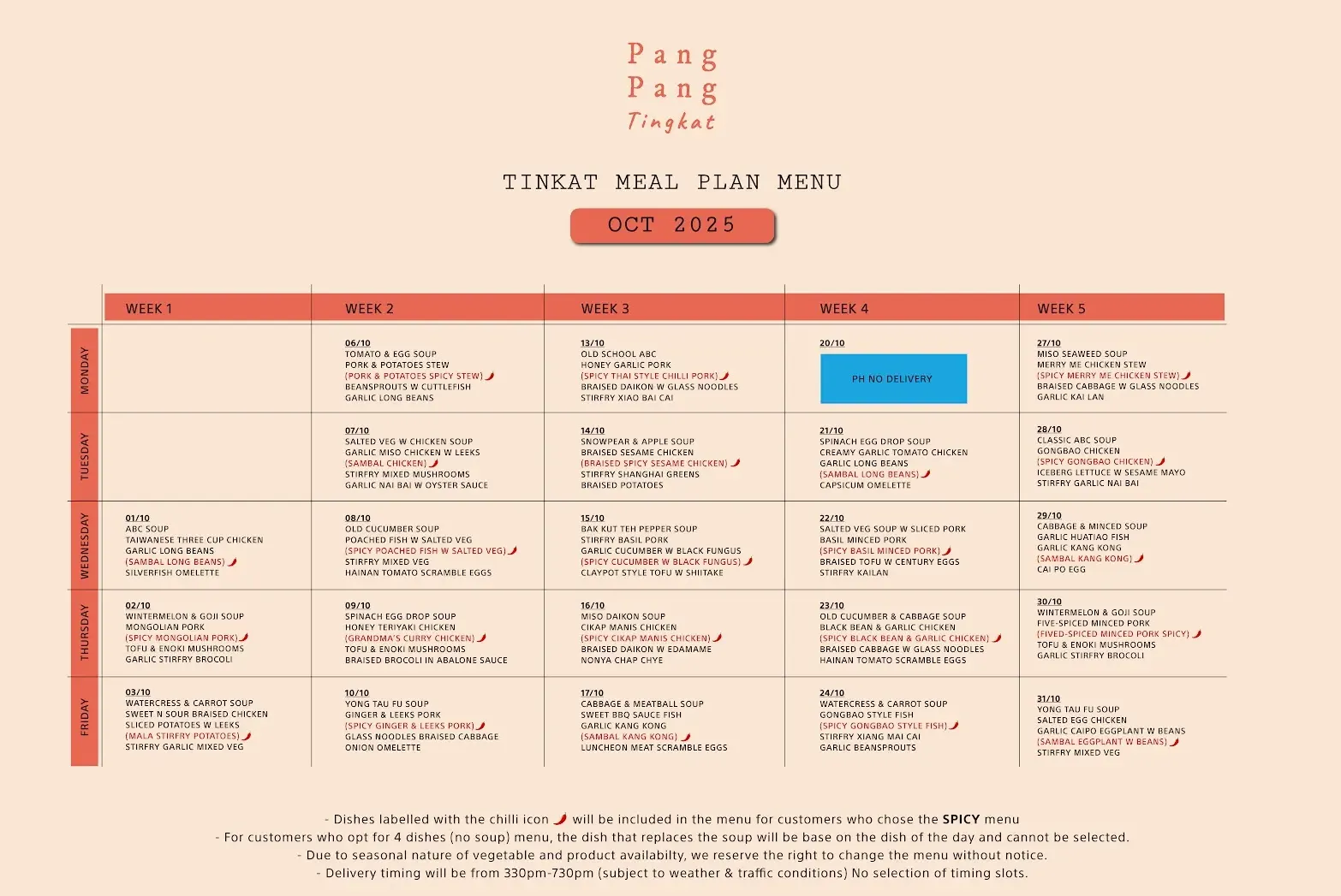 Delivery: Tingkat Services is only served from Monday to Friday. No delivery on Public Holidays, Saturdays/Sundays. No Lunch Delivery.