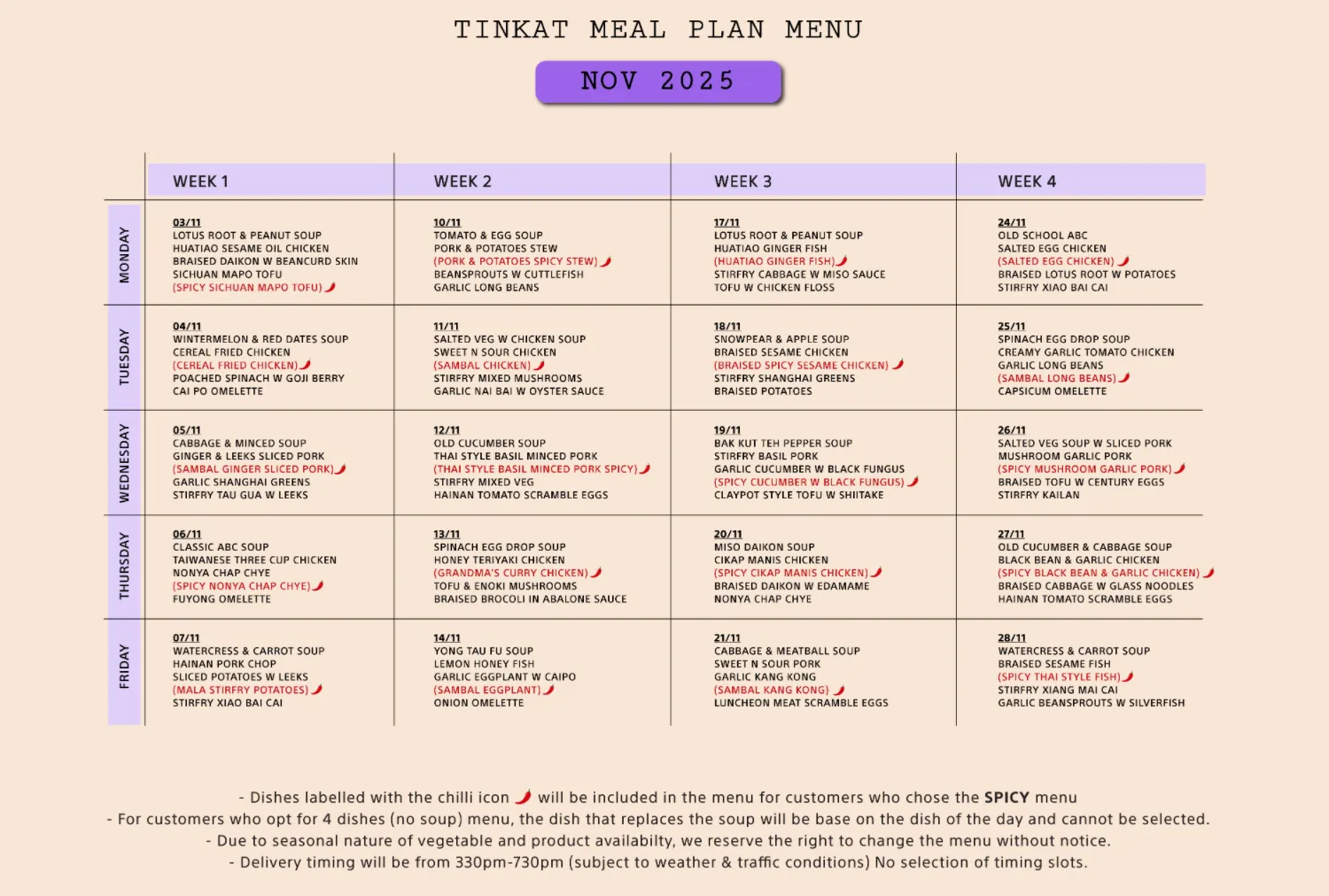 Delivery: Tingkat Services is only served from Monday to Friday. No delivery on Public Holidays, Saturdays/Sundays. No Lunch Delivery.