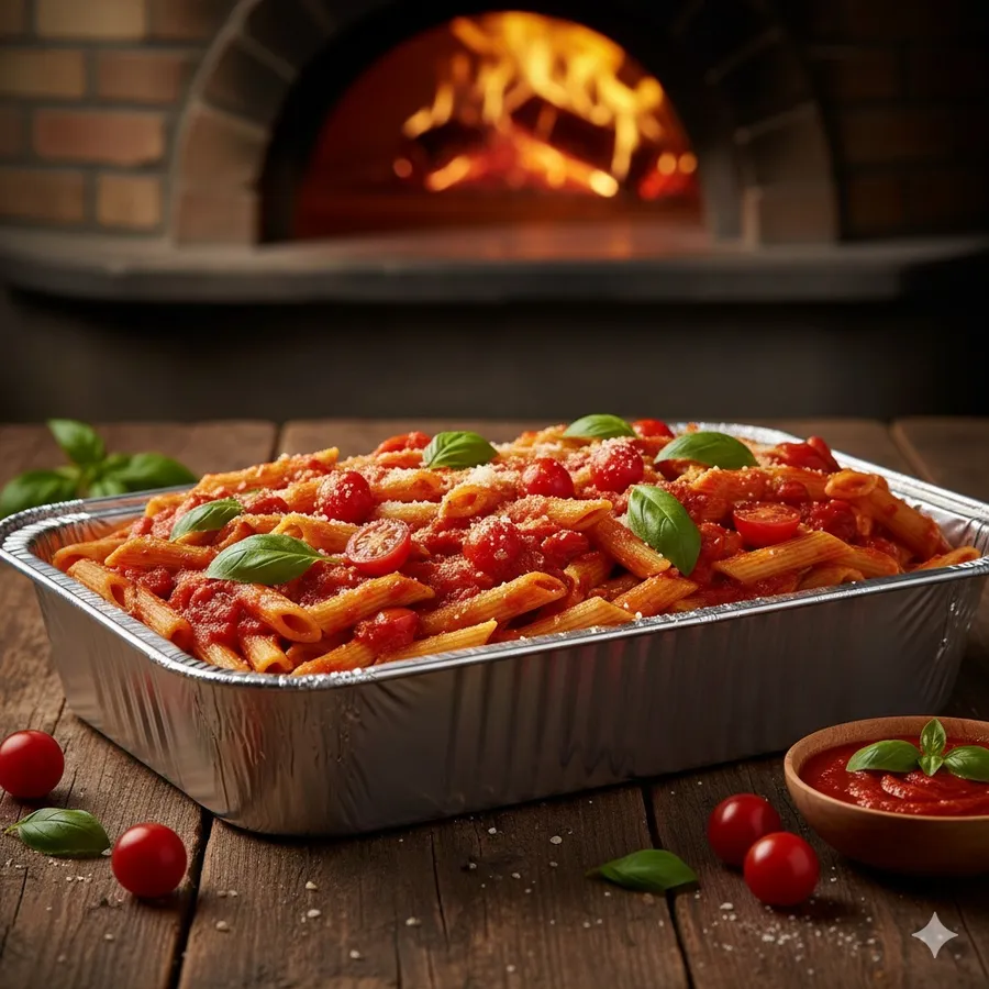 Penne pasta with garlic, chillipadi, basil in tomato sauce