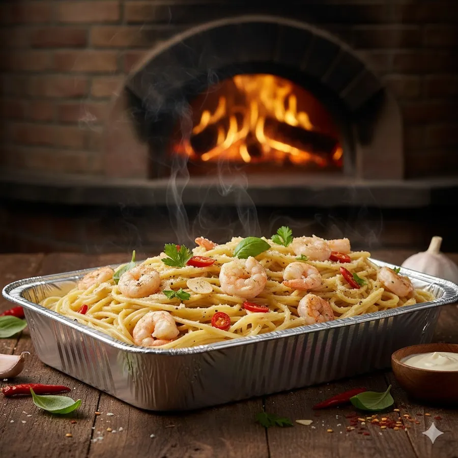 Spaghetti with prawns, garlic, chilli in cream sauce