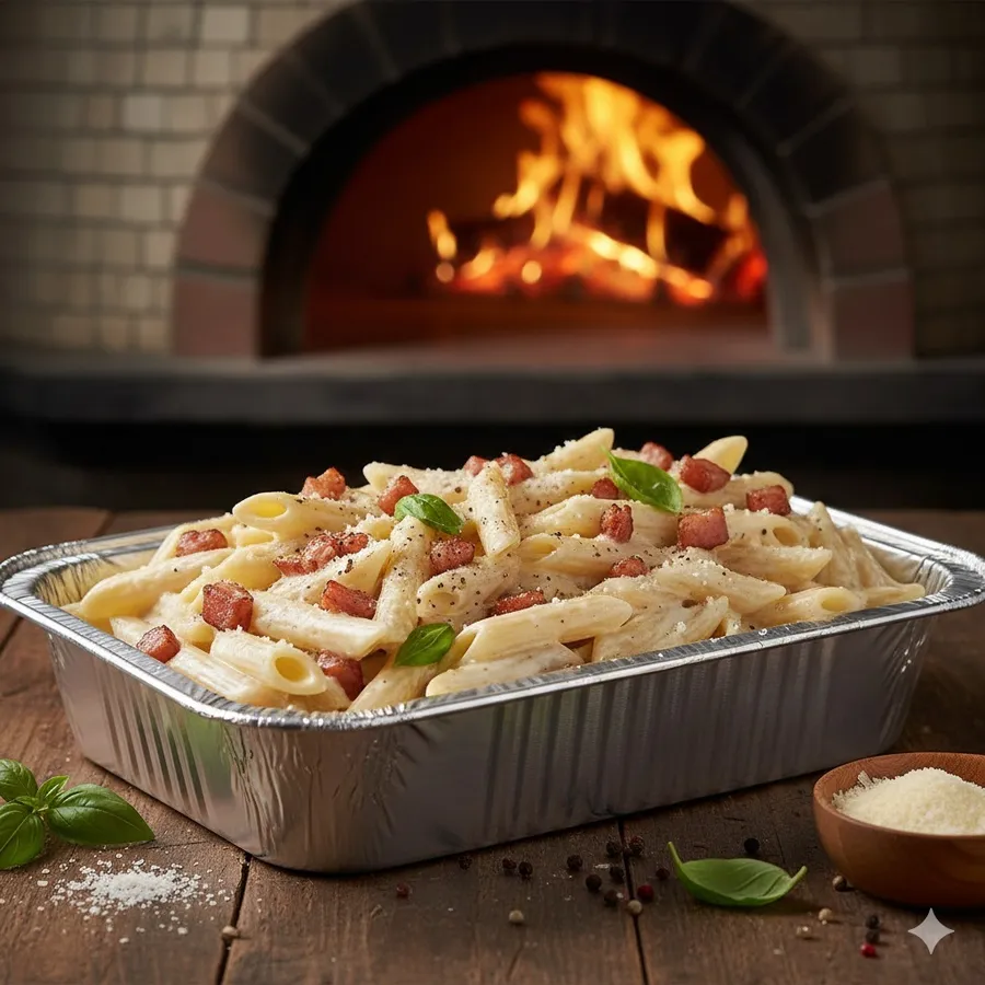 Penne with sautéed turkey bacon, egg yolk, pecorino cheese in cream sauce