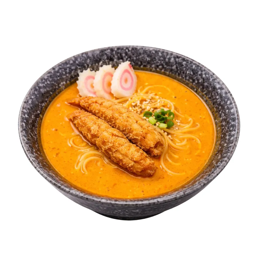 Crispy prawn tempura and thick wheat flour noodles in broth