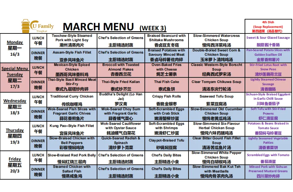 Single Meal 20 Days Tingkat (3 Dishes 1 Soup / 4 Dishes)